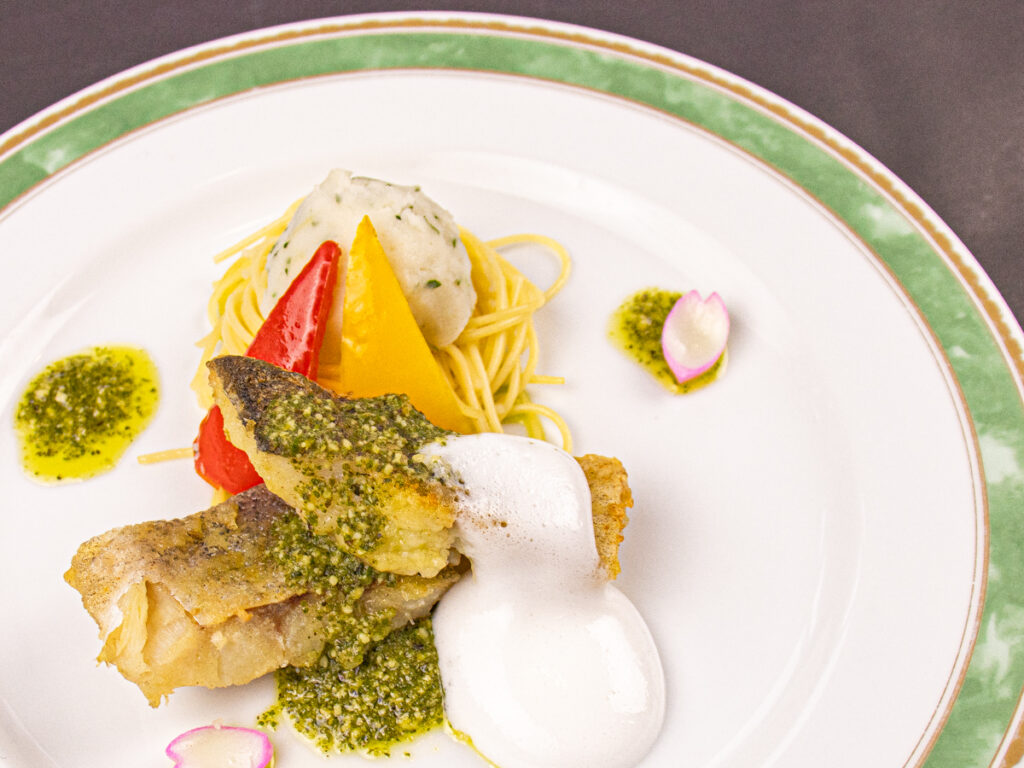 続く焼物には、ふっくらと焼き上げたそこ鱈を。香り豊かなバジルソースを合わせることで、和と洋が調和する軽やかな味わいに仕上げました。淡白な身に爽やかなソースが寄り添い、思わず箸が進む一品です。